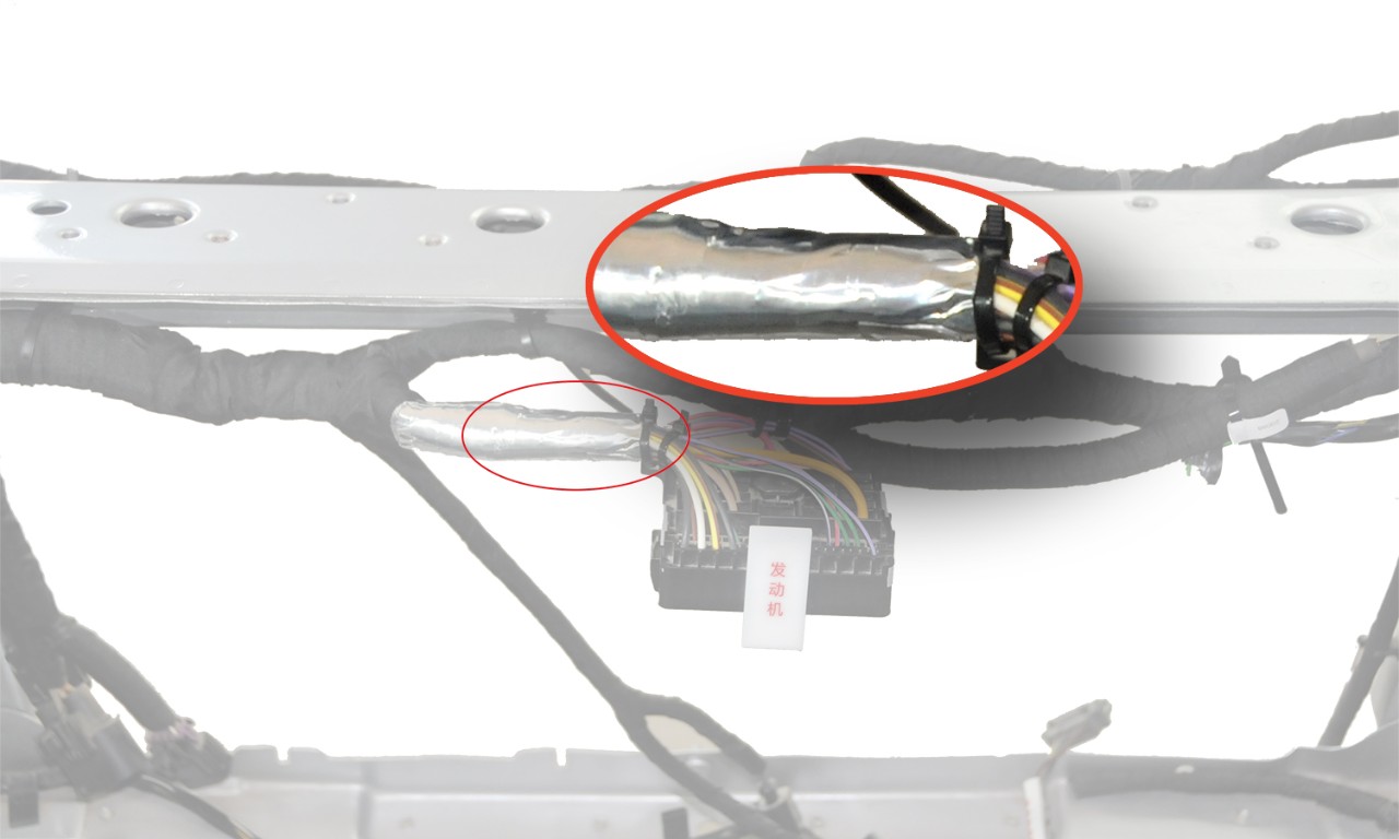 线束在捆扎叠件和交叉件时起着至关重要的作用, 即使微小的线束设计或装配缺陷都可能导致电磁波干扰。 为避免磁场干扰,保障信号稳定传输,工程师指定屏蔽效果好的屏蔽材料及外部缠绕胶带。